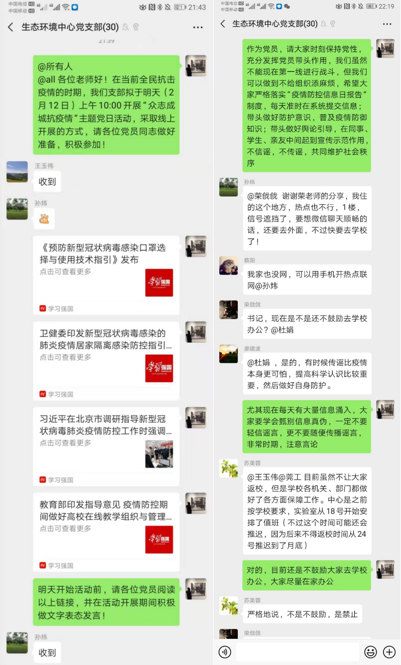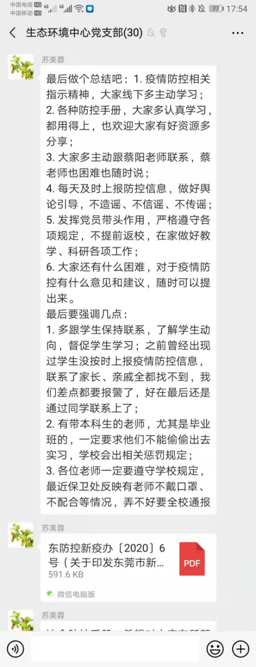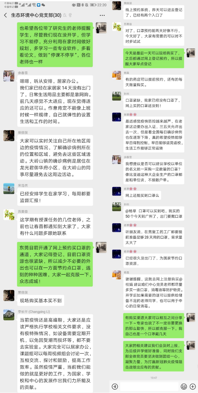 活动开始前已预先在微信群内上传了中央关于加强新型冠状病毒感染的肺炎疫情防控相关工作要求、重要指示精神等,包括《预防新型冠状病毒感染口罩选择与使用技术指引》、《新型冠状病毒感染的肺炎防控中居家隔离医学观察感染防控指引(试行)》、《习近平在北京市调研指导新型冠状病毒肺炎疫情防控工作时强调以更坚定的信心更顽强的意志更果断的措施坚决打赢疫情防控的人民战争总体战阻击战》以及教育部印发的《关于在疫情防控期间做好普通高等公司在线教学组织与管理工作的指导意见》,并要求全体党员进行学习。中心各党员就对疫情防控的指引等文件的学习分享了心得,表示此次的疫情需大家齐心努力,虽然现在我们不能站到第一线进行“战斗”,但会发挥党员带头作用,积极配合各部门的工作,减少外出,不提前返校,在家做好各项科研教学工作;每天及时上报防控信息,做好舆论导向,不造谣、不信谣、不传谣;积极和员工联系,保证员工不提前返校,充分利用在家的时间做好学习规划,做到停学不停课。