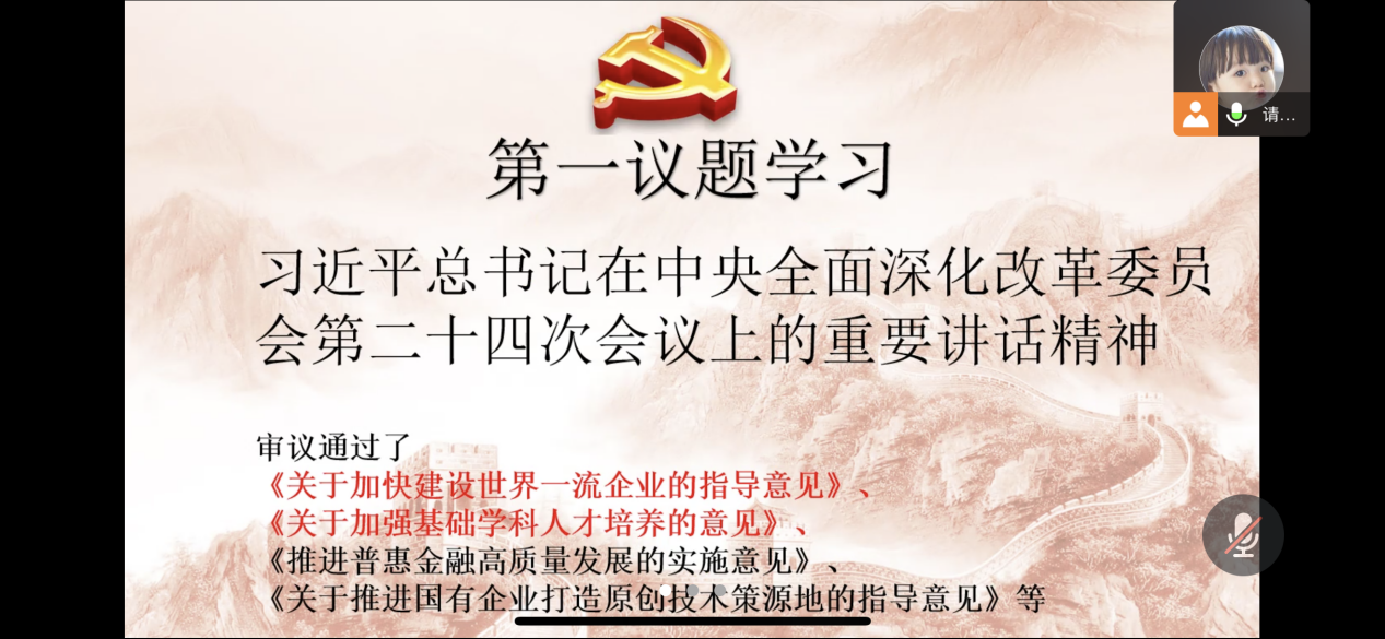 会上,党支部书记张媚老师首先开展了“第一议题”的学习:学习贯彻习近平总书记在中央全面深化改革委员会第二十四次会议上的重要讲话精神,全体成员展开了讨论。