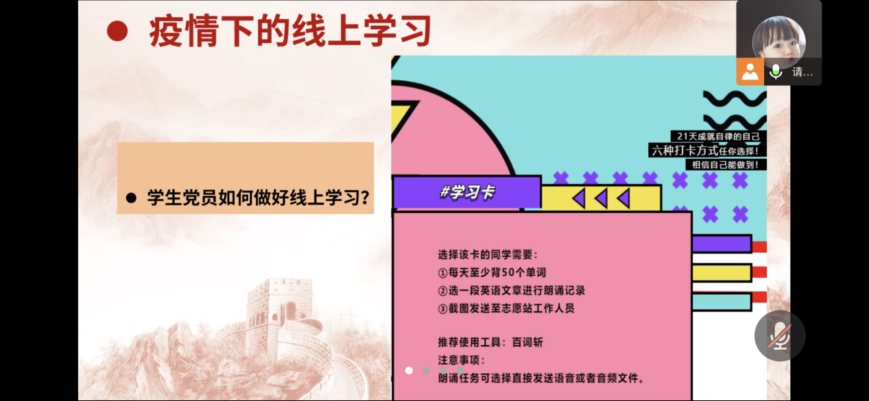 在公司产品大讨论环节,党支部全体党员同志一起学习了《伟德国际唯一官网入口“深化课堂教学改革+提升课程育人质量”公司产品大讨论工作方案》等文件精神。员工党员结合如何开展线上学习及新形势下如何做好疫情防控工作等展开热烈讨论,张老师提出,目前bevictor伟德官网正在开展21天打卡的活动,也是让更多同学参与到坚持、自律的居家生活中,保持健康良好的生活作息和精神面貌,待疫情散去,以崭新的姿态重新回到校园。