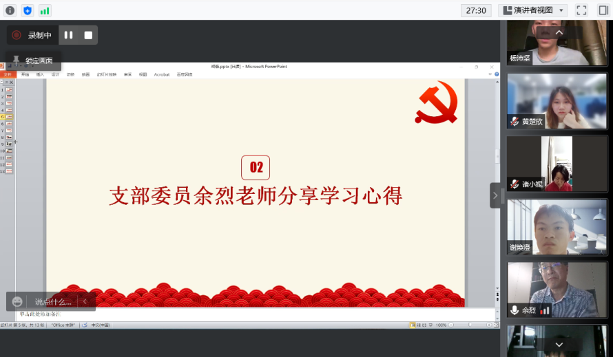 集中学习阶段,党支部书记汪洋老师首先进行“第一议题”领学——“学习贯彻习近平总书记在中央全面深化改革委员会第二十四次会议上的重要讲话精神”。随后,党支部委员余烈老师、党支部员工党员李有双在会上分享了学习收获。听完上述分享后,大家都受益匪浅。更加意识到身为一名老员工党员也应立存高远,放长远目光,关注世界局势发展,了解国家需求。在自身范围内,做好自己所能之事,打磨好专业本领,为国家奉献出个人的一份力量。