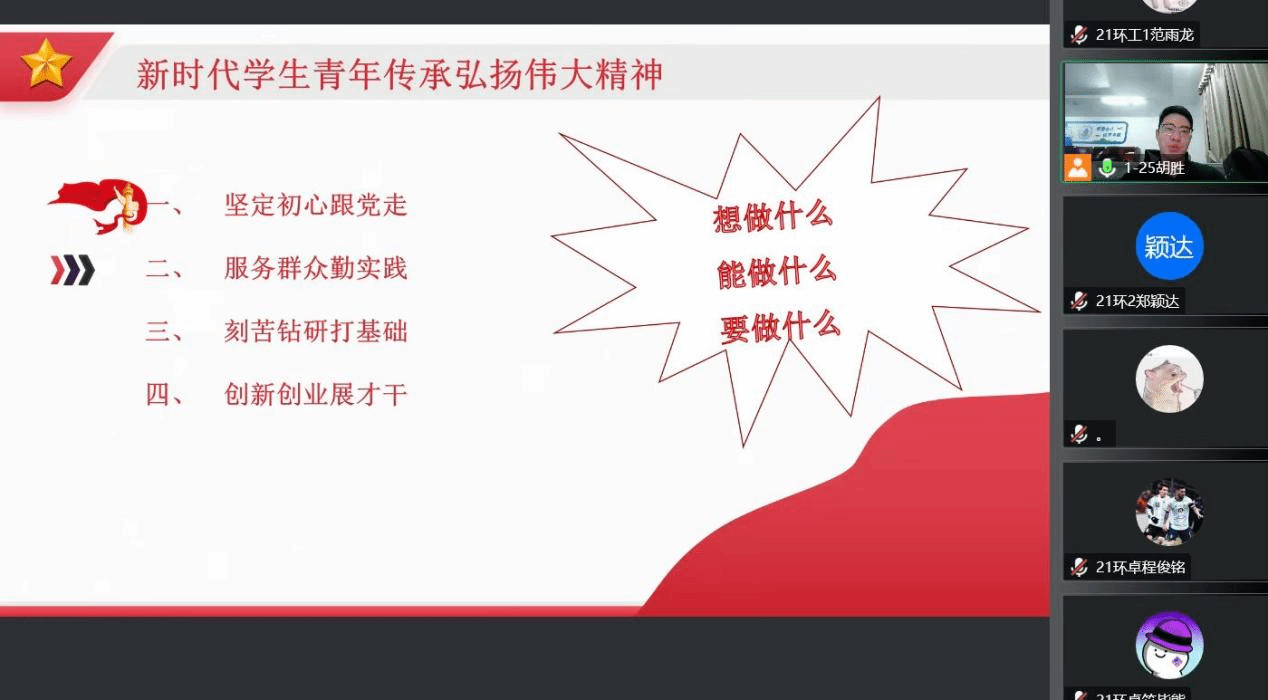 环境类党课胡胜老师围绕“中国共产党人精神谱系与新时代老员工”为主题,通过分析“共产党人的精神谱系”,“时代中产生的伟大精神”,“伟大精神的精髓要义”和“新时代员工青年传承弘扬伟大精神”四个方面层层深入,落实到新时代青年员工的成长和发展,指出新时代员工青年要传承弘扬伟大精神,要“坚定跟党走、服务群众勤实践、刻苦钻研打基础、创新创业展才干”。学习莞工之星,做好新时代青年。