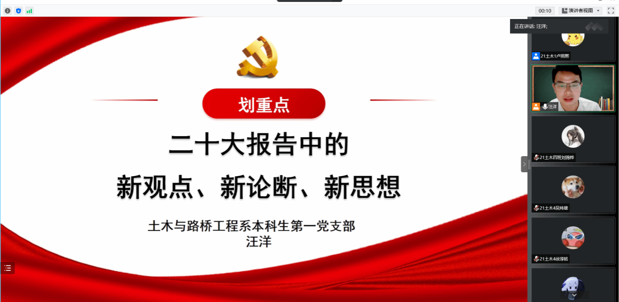 土木类党课汪洋老师以“二十大报告中的新观点、新论断、新思想”为重点,围绕大会主题、三个务必、十年来的三件大事、全面建设社会主义现代化国家、全面推进中华民族伟大复兴关键在党、五个“必由之路”、以及建设社会主义现代化国家的内在要求等六个方面给同学们深入解读二十大报告的内容。并深情寄语我们广大青年牢记:“青年强,则国家强!”努力锻炼自身本领,坚定不移听党话、跟党走,怀抱梦想又脚踏实地,敢想敢为又善作善成,立志做有理想、敢担当、能吃苦、肯奋斗的新时代好青年,让青春在全面建设社会主义现代化国家的火热实践中绽放绚丽之花。