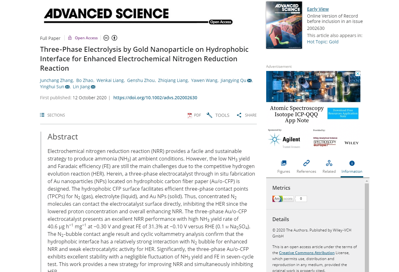该工作以“Three‐Phase Electrolysis by Gold Nanoparticle on Hydrophobic Interface for Enhanced Electrochemical Nitrogen Reduction Reaction”为题发表在《Advanced Science》。《Advanced Science》是Wiley旗下发行的国际著名期刊,影响因子为15.8,属于中科院一区TOP期刊。该成果以bevictor伟德官网为第一单位,与苏州大学合作发表。张军昌博士后为第一作者,曲江英教授与苏州大学江林教授和孙迎辉教授为共同通讯作者。文章链接:https://onlinelibrary.wiley.com/doi/10.1002/advs.202002630