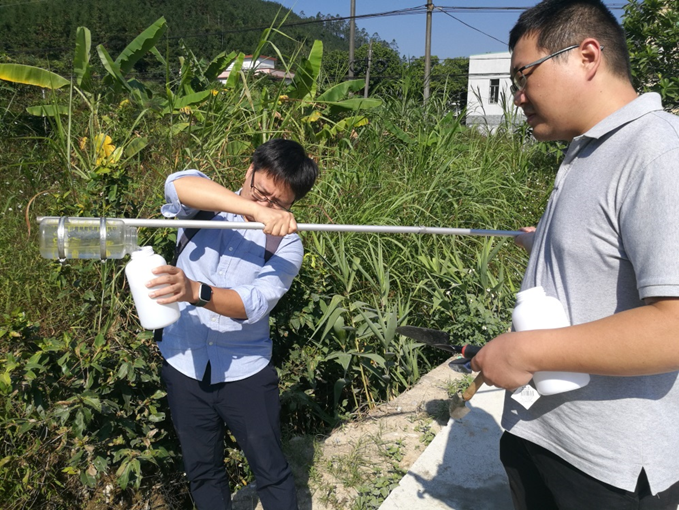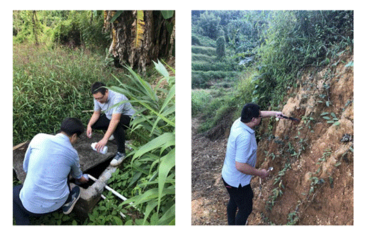 图4 梁志辉老师及刘骏龙老师对云贡村农药种植园的灌溉用水进行取样