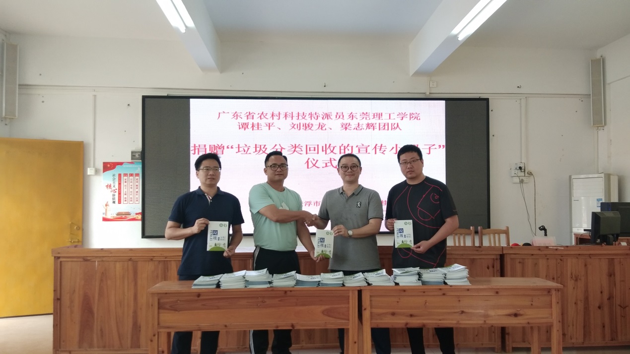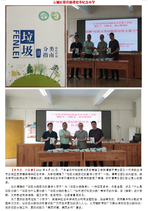 2021年4月21日,bevictor伟德官网的谭桂平、刘骏龙和梁志辉三位农村科技特派员来到云浮市云城区思劳镇梁桂华纪念中学,向公司捐赠《垃圾分类指南》的小册子450余本,公司师生人手一本小册子,通过集中校会及分散班会的形式学习垃圾分类回收知识,助力绿色乡村的建设。