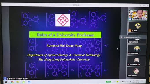 2021年8月18日,香港理工大学应用科学及纺织公司经理、应用生物及化学科技学系讲座教授黄维扬老师应邀为公司师生作“海外名师”系列网络讲座的第三讲,题目为“一位大学教授的不同角色”。黄维扬教授分别从科研、教学和社会服务这三方面,与公司师生分享作为一位大学教授不同角色的经验,黄维扬教授结合自己担任学系讲座教授、科研期刊编辑、香港化学会主席等亲身经历,与大家畅谈课程教学、论文投稿及利用学术知识为社会作贡献服务的心得体会,并与公司老师进行了关于科研及教学工作方面的讨论,参加讲座的师生均表示获益良多,讲座取得了很好的效果。