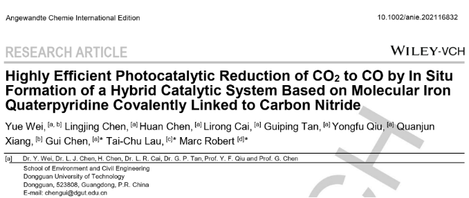 2022年1月5日,公司魏曰博士后作为第一作者,以伟德国际唯一官网入口为第一单位,在国际顶级期刊《Angewandte Chemie International Edition》上发表题为“Highly Efficient Photocatalytic Reduction of CO2 to CO by In Situ Formation of a Hybrid Catalytic System Based on Molecular Iron Quaterpyridine Covalently Linked to Carbon Nitride”的学术论文。这是以公司为第一单位发表在《Angewandte Chemie International Edition》上的第一篇学术论文。《Angewandte Chemie International Edition》影响因子15.3,属于中科院一区顶级期刊,也是公司认定的T2类权威期刊。在该工作的基础上,魏曰博士后还成功申请到2021年度广东省基础与应用基础研究青年基金项目。魏曰博士后合作导师为邱永福教授和陈贵教授。