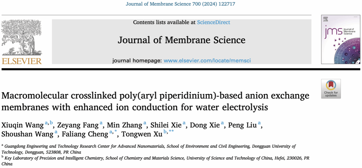 公司王秀琴博士近期在阴离子交换膜电解水制氢领域取得重要研究进展。该成果以“Macromolecular crosslinked poly(aryl piperidinium)-based anion exchange membranes with enhanced ion conduction for water electrolysis”为题发表在国际著名期刊《Journal of Membrane Science》(IF = 9.5,中科院一区Top)。该论文第一署名单位为伟德国际唯一官网入口,王秀琴博士是该论文的第一作者,程发良教授和中国科学技术大学的徐铜文教授为论文的共同通讯作者。