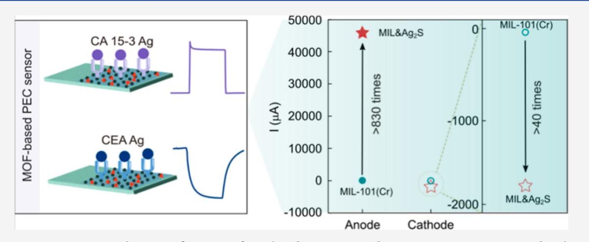 目前乳腺癌已经超过肺癌成为全球最常见的癌症。因此,针对乳腺癌的早期诊断极其重要。癌抗原15-3(CA15-3)和癌胚抗原(CEA)是乳腺癌肿瘤的标志物,通过检测这两种标志物,能够有效诊断乳腺癌。基于此,本文开发了一种双光电流联合检测乳腺癌标志物的光电化学免疫传感器。该传感器(MIL&Ag2S)是基于MIL-101(Cr)-Ag2S复合体构建的,在不同的电压下,复合的Ag2S不仅增强了电子-空穴分离效率,还提升了传感器的电导率,可以产生稳定的双光电流信号,从而实现对肿瘤标志物CA15-3和CEA的联合检测。与传统的单一检测的光电化学传感器的方法相比,该检测策略提高了对乳腺癌肿瘤标志物检测的准确性。实验结果显示,该传感器在CEA与CA15-3联合检测中性能优良,检测限分别为CEA的0.0023 ng/mL和CA15-3的0.014 U/mL。在商用人血血清样品测试中,结果同样令人满意,验证了其高效可靠的检测能力。本工作不仅为高效光电化学免疫传感器的发展提供了有力支持,更在乳腺癌的早期检测、诊断及治疗中展现了广阔的应用前景,同时也为双信号模式传感器的构建提供了新的思路与模式。