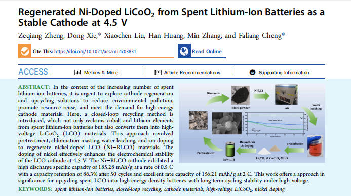 公司广东省新型纳米材料研究与应用工程技术研究中心研究团队近期在废旧锂离子电池正极回收再生领域中取得新研究进展,该研究成果以“Regenerated Ni-Doped LiCoO2 from Spent Lithium-Ion Batteries as a Stable Cathode at 4.5 V”为题发表在国际著名期刊《ACS Applied Materials & Interfaces》(IF = 9.5,JCR一区)。公司郑泽强硕士研究生为第一作者,谢东副教授与程发良教授为论文的共同通讯作者。