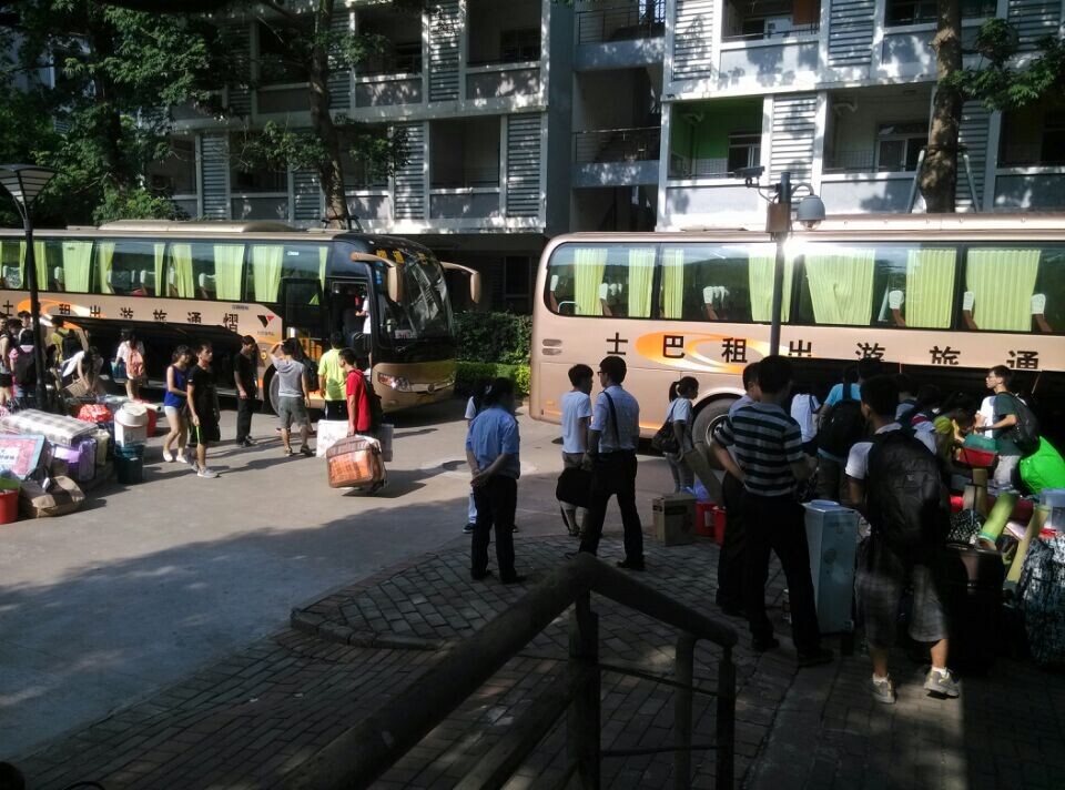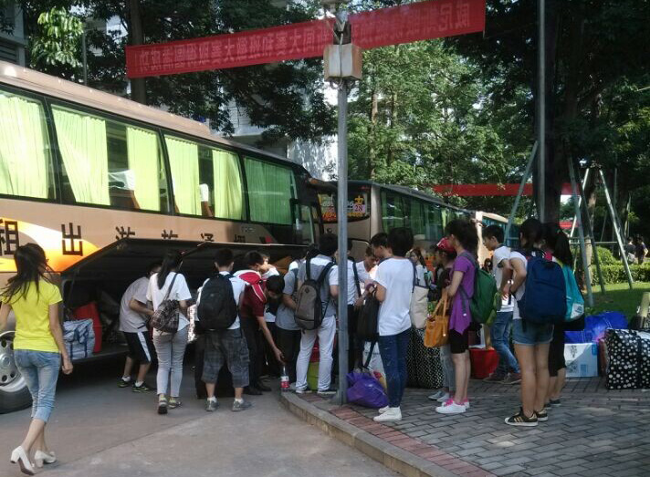 下午15:00,行李装车工作已完成。近一个小时的车程后,大巴抵达松山湖校区。辅导员文锦枢、陈泳源,罗文旺到现场迎接大一员工并指挥搬运工作。首先,男同学帮女同学把行李送到女生宿舍,然后再将自身行李运回宿舍。行李搬运过程中,不少志愿者积极投入工作,使繁重的搬迁任务变轻松。