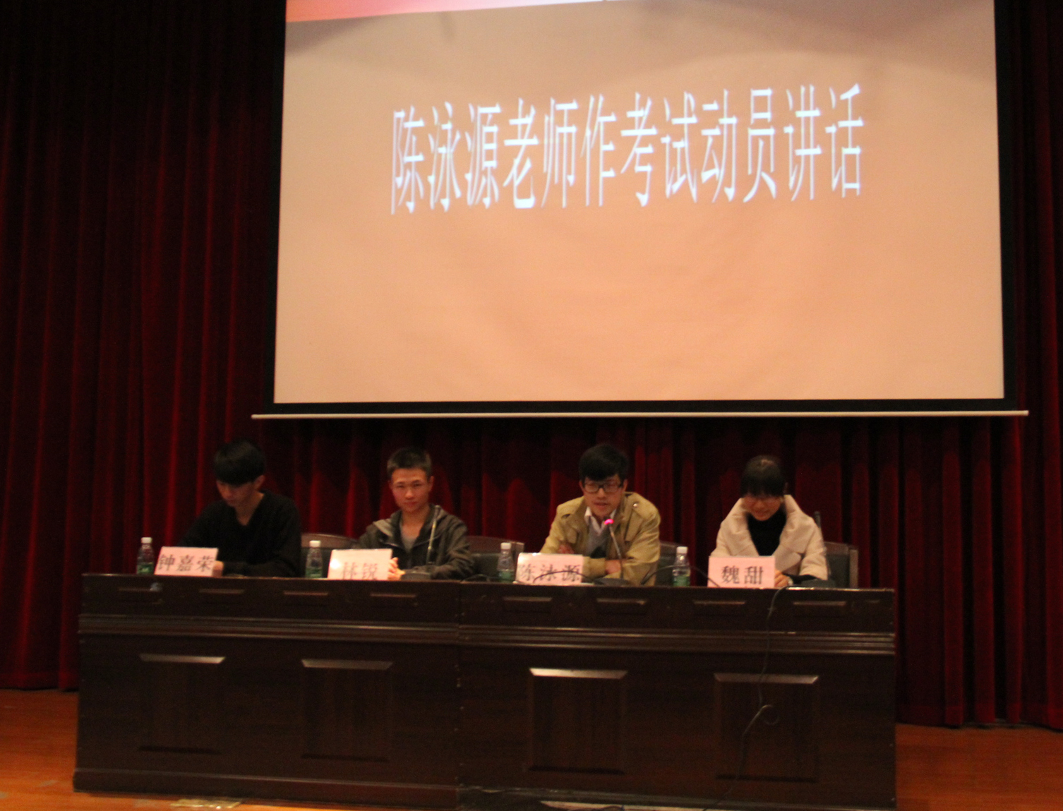 在作完学习经验介绍后,便是同学提问的环节。在场的同学积极提问,陈老师和助班魏甜、林锐就大家的疑惑作出详细的回答。提问环节过后,陈老师就作考试动员讲话。他先对考勤的意义作了解释说明,又重申了对考纪考风的重要性,着重提出不能作弊,并说出作弊的严重后果。然后,他对想要转专业的同学做出善意的提醒,他最后表示预祝大家在期末考试中取得好成绩。