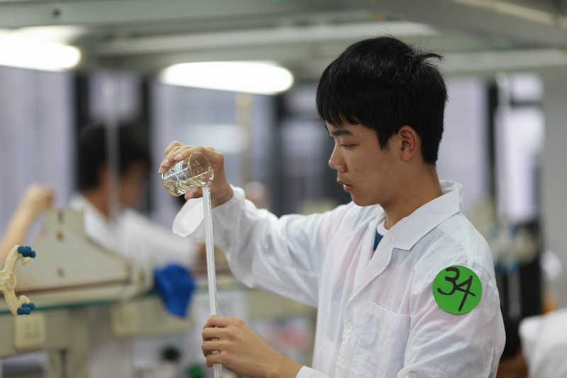 比赛时,选手们都认真思索实验原理、实验步骤,聚精会神,认真完成实验。评委老师与实验室助理认真仔细观看选手的操作,并公平公正地为各选手打分。