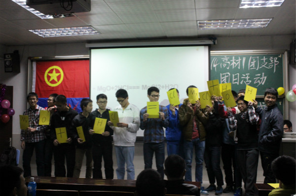 活动中,有“化学海洋齐徜徉” 及“演绎化学方程式”等小活动,该团支部组织现场参与人员分组进行活动。“化学海洋齐徜徉”中,团员青年们积极参与,其激烈的抢答营造出强烈的学习氛围。而在“演绎化学方程式”这一活动中,团员青年们通过对知识齐徜徉,团结合作,共同演绎方程式,融合了其成员力量,增强了其小组的凝聚力。最后,团日活动之“灵动方程式”圆满落幕。