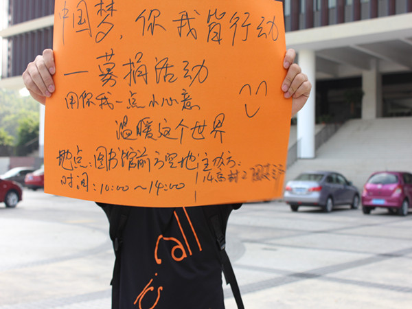 首先,在团支书书记陈铁的分配下,该团支部分为两个小组。一个小组驻扎大本营,负责接收募捐物并登记募捐者的姓名、募捐物及数量。另一个小组团员主要分布在莞城校区四号楼大厅、校道及北门门口对本校员工及附近居民宣传募捐。
