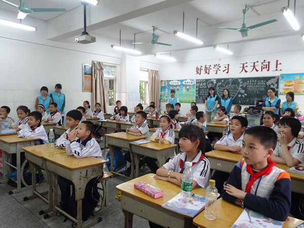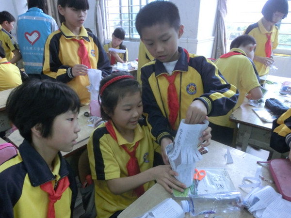 该校首先由黄楚伟队员简单地给同学们此次环保宣传志愿活动的目的和流程。然后队员刘学微用通俗易懂的语言和有趣的PPT给四一班的同学们讲解了有关生活垃圾分类、污染、处理等方面的理论知识,同学们听得津津有味,还不时对不能理解的知识提出疑问。授课结束后,队员卢继缮为同学们表演了化学小魔术,同学们都被奇妙的化学实验吸引了,都在为奇妙的变化感到不可思议,课堂气氛达到了高潮。最后一个环节是手工艺制作,此次活动没有限定内容,而是让同学们充分发挥他们的想象力,制作作品。经过二十分钟的热火朝天的动手,同学们基本都完成他们的作品,而且都各有特色;最后队员们选出了五个比较有代表的作品,并给了他们每人一份精美的礼品作为奖励。