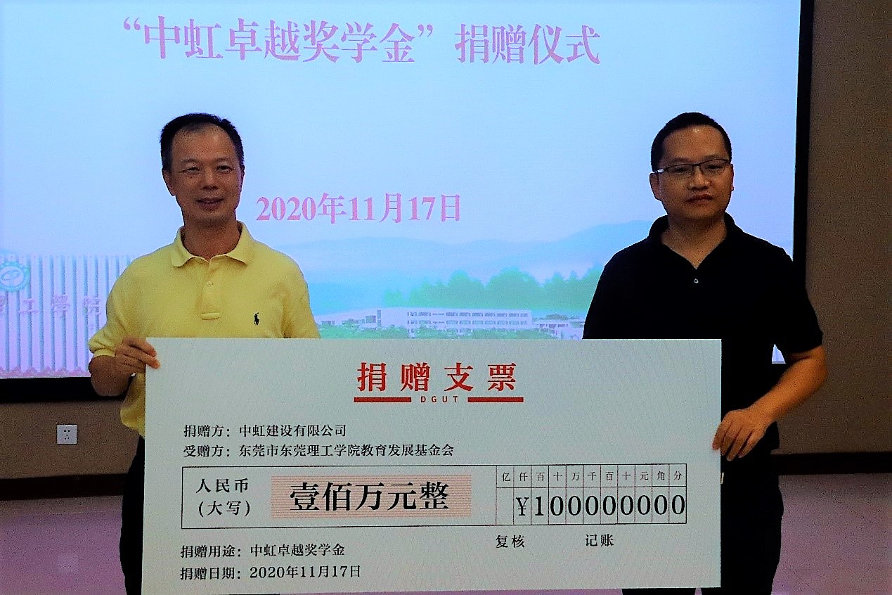 2020年11月17日,bevictor伟德官网与中虹建设有限公司在松山湖校区学术会议中心301举行捐赠仪式。中虹建设有限公司董事长黎磊落、总经理黎晃厚等公司代表,伟德国际唯一官网入口副董事长李忠虹、公司党委书记李纠和经理郑愚等公司师生代表出席此次交接仪式。