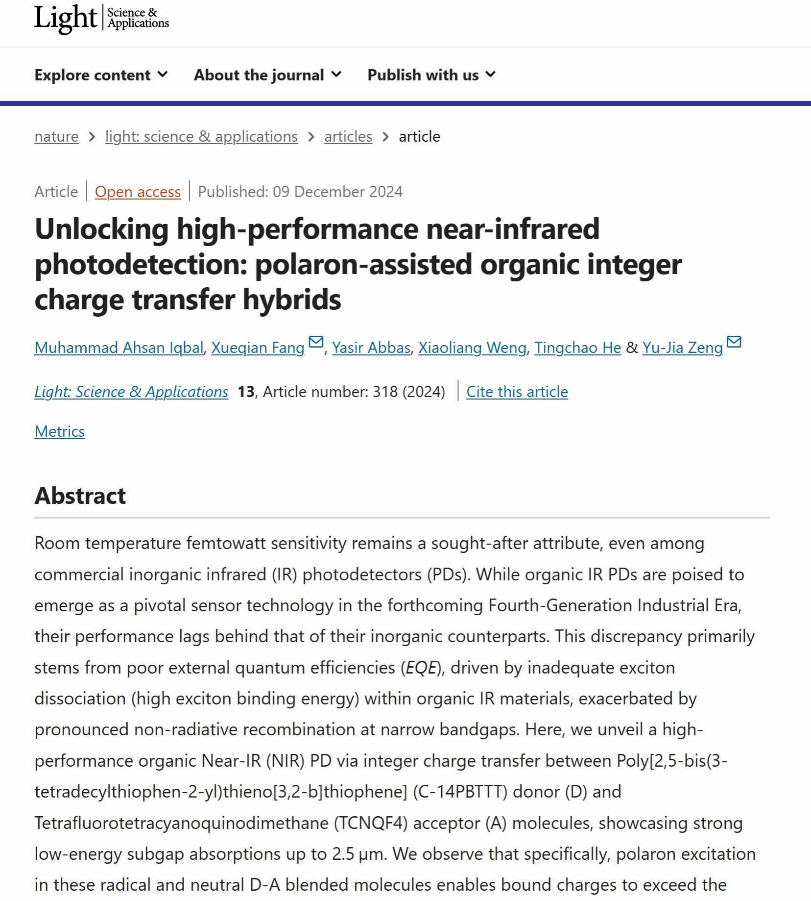 最近,Nature子刊、国际光学顶级期刊《Light: Science &Applications》(IF:20.6)刊发公司房学谦教授课题组在近红外光探测领域的新成果,题为“Unlocking High-Performance Near-Infrared Photodetection: Polaron-Assisted Organic Integer Charge Transfer Hybrids (解密高性能近红外光探测:极化子辅助的有机整数电荷转移混合法)”,Muhammad Ahsan Iqbal博士后为论文第一作者,房学谦教授和深圳大学曾昱嘉教授为通讯作者,东莞理工为论文第一完成单位。