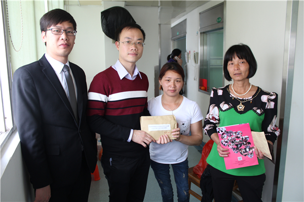 君书记一行人在晓慧家属的陪同下来到了晓慧的病房前,由家属口中得知晓慧由于白细胞的减少,抵抗力降低,只能入住被隔离开来的无菌仓,外界只能和她打电话进行沟通。他们在电话里安慰晓慧要配合医生,安心治病,同时鼓励晓慧及其家属要勇于与病魔抗争,争取早日康复,回归校园。最后,君书记、辅导员文锦枢以及银丰逸居酒店代表人员分别给家属送上了善款,其中包括化环公司教工捐款13400元、化环公司员工会基金会10000元、伟德国际唯一官网入口善款2000元、化环公司员工会理事会及其好友捐赠23700元和银丰逸居酒店善款10000元,总计此行善款总额59100元。除此以外,银丰逸居酒店代表人员还带来了银丰逸居酒店特意为晓慧制作的心意卡,卡上面有酒店全体员工的签名和早日康复的祝福语。当晓慧母亲接过善款和心意卡,已感动得泣不成声,用家乡话一次一次地对各位领导老师和社会人士以及同学对晓慧的关爱表达万二分的感谢。