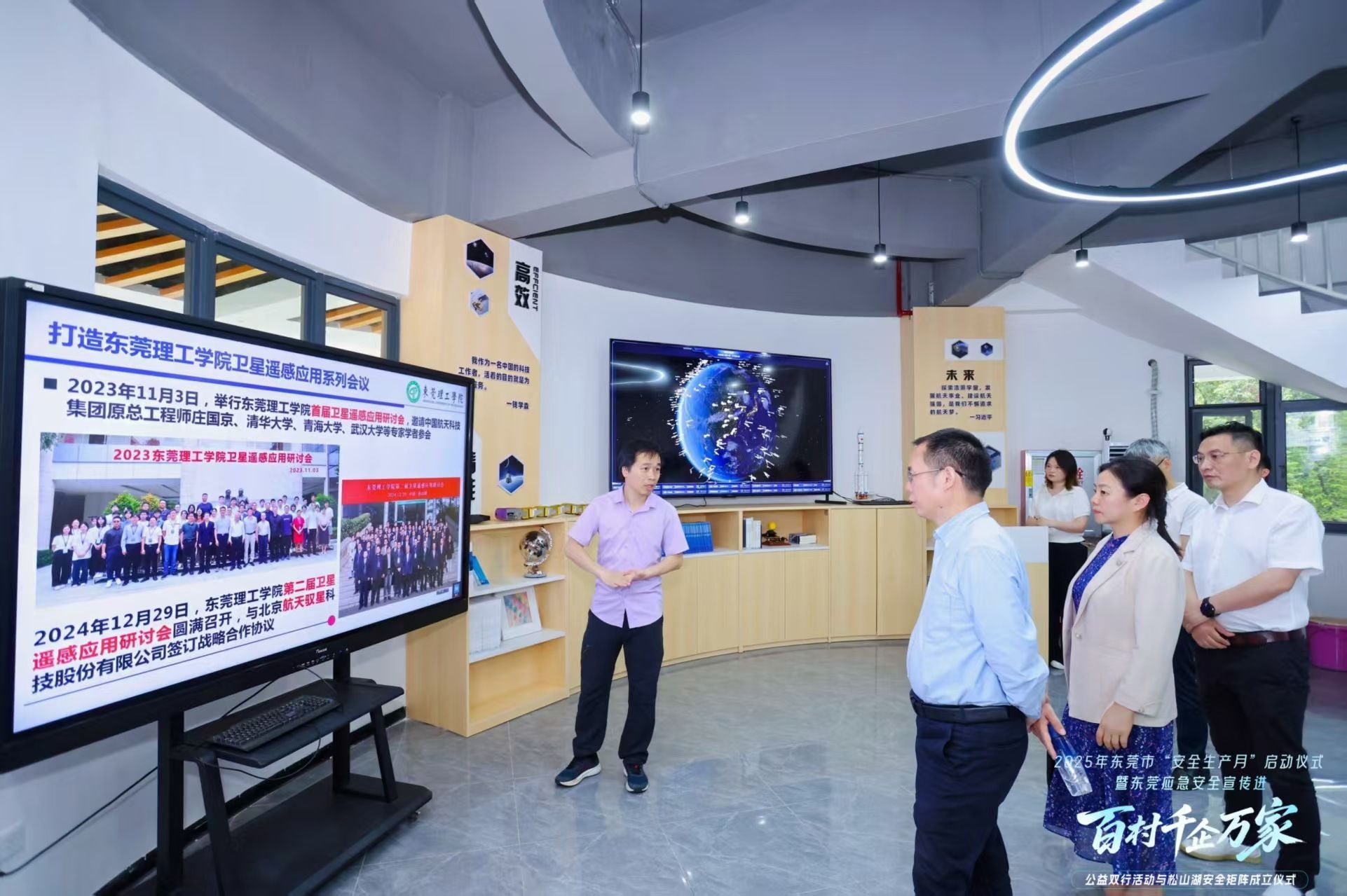 仪式上,松山湖安全矩阵正式启动。该矩阵整合高校、企业、社区资源,将通过技术共享、数据互通、应急演练等方式,构建覆盖全域的安全防控网络。张伟伟教授协同省重点实验室及卫星地面接收站技术团队,全程协助接待到访的政府及行业嘉宾,展示了公司在智能监测、灾害预警等领域的科研成果,为安全矩阵的技术赋能提供支撑。