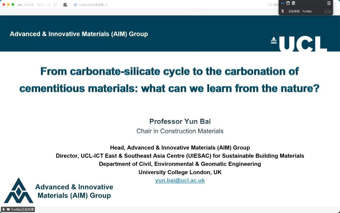 12月5日,邀请了英国伦敦大学公司(UCL)白云教授给公司师生做《From carbonate-silicate cycle to the carbonaton of cementitious materials: what can we learn from the nature?》的线上学术报告,主要介绍全球气候变化背景下,通过硅酸盐矿物风化吸收CO2,最终形成碳酸盐岩沉积,实现碳的长期封存的技术方法,并给出相关案例,揭示出人与自然和谐相处的深刻哲理,引起参会师生的广泛共鸣。