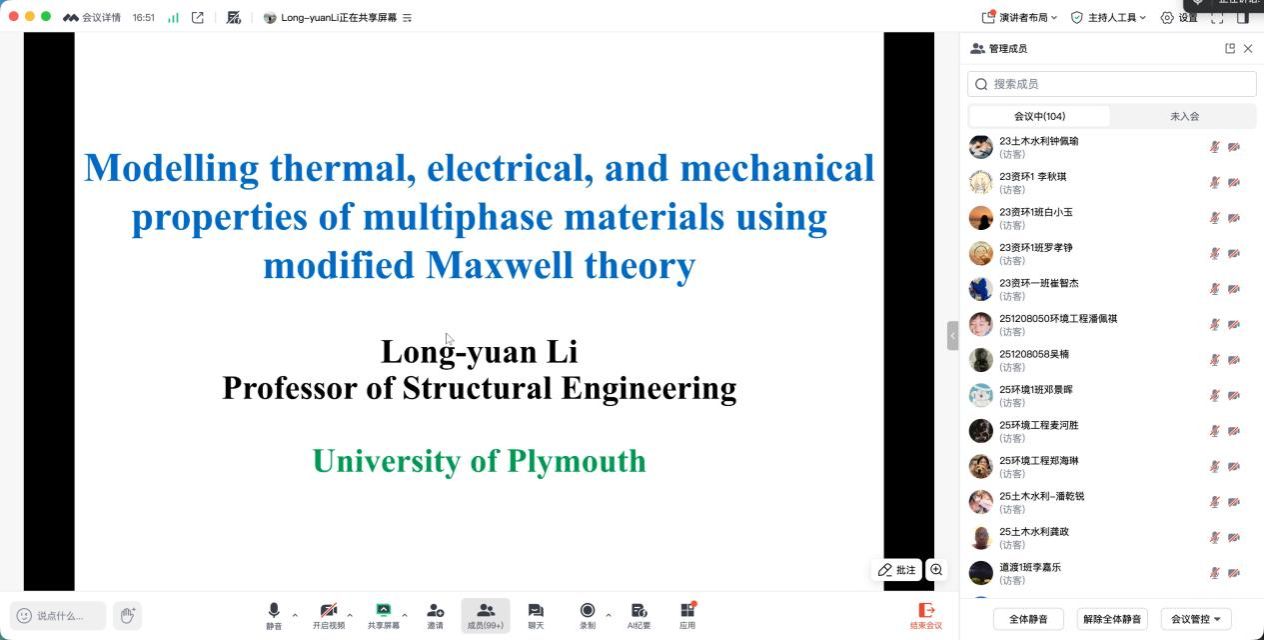 12月2日,邀请了英国普利茅斯大学Longyuan Li教授(欧洲科学与艺术院院士、“洪堡”学者)给公司师生做了《Modelling Thermal, Electrical, and Mechanical Properties of Multiphase Materials Using a Modified Maxwell Theory》的线上学术报告,主要介绍提出的一种修正版的麦克斯韦理论,通过将渗流阈值引入预测公式,实现了上下限的统一表述,该方法可有效用于预测再生骨料混凝土的弹性模量、钢纤维增强混凝土的热导率与电导率以及碳纳米管增强复合传感器的电导率等计算,并与参会的师生就相关问题进行了讨论。