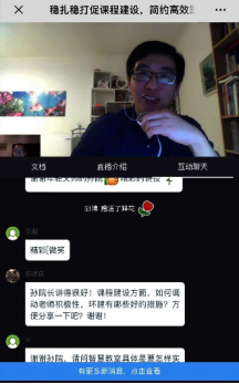 在一个多小时的分享过程中,孙璨老师基于多年一线教学及教学管理的心得,结合在线教学从准备到实施的全过程实践,阐述了如何在充分调研的基础上,简约高效地构筑在线教学的“空中课堂”,形成管理闭环,并分享多个典型教学案例及在线混合式教学的策略建议,进而对于如何把握契机推动可持续的课程建设改革进行了更深入的思考和讨论。整场直播课下来,老师们纷纷表示获益匪浅,意犹未尽,引起热烈的反响,同时,孙璨老师还在课后就大家关心的一些问题给予了进一步的解答释疑。