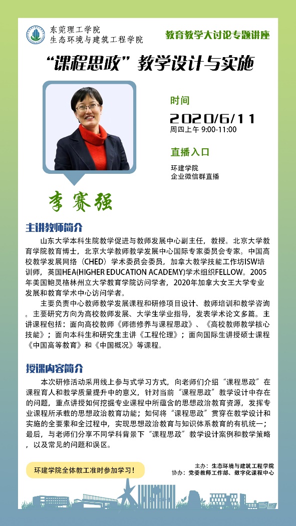本次讲座的开展也为bevictor伟德官网今年公司产品大讨论的重点工作之一 “绿水青山就是金山银山”系列主题课程思政教学案例征集活动奠定了坚实的基础。在本学期结束前,公司将遴选出多门优秀的课程思政教学案例,并邀请李赛强教授通过云会议的形式给予逐一点评指正。待教学案例修改完善后,进一步通过视频录制的方式固化成果并推广。