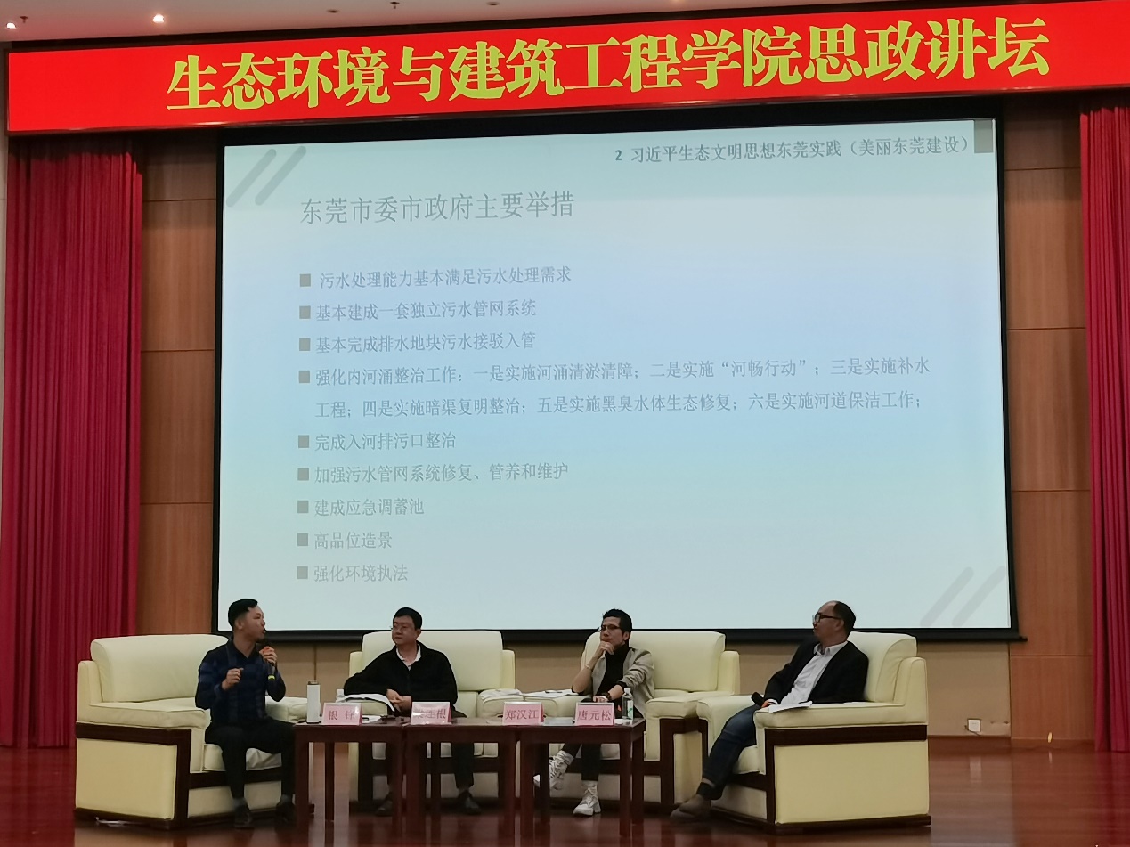 讲座中,四位嘉宾各抒己见,就重点问题进行热烈生动讨论。唐元松在列举了陕西秦岭别墅违建的典型案例后,指出这既是生态文明的案例,也是政治建设的案例,强调保护生态环境应该推动形成绿色发展方式和生活方式。银锋结合个人生活实际与观察思考,指出生态文明建设是一场涉及生产方式、生活方式、思维方式和价值观念的革命性变革,必须依靠制度和法治稳步推进。来自市环保局的梁连根副科长通过列举大量数据和实例,从市委市政府的大力投入以及由此带来的东莞空气、水体、绿化、企业和地区GDP单位产值能耗的变化、建筑设计的变化,生动诠释了东莞生态文明建设取得的巨大成就。梁连根指出,东莞市委市政府坚定不移贯彻落实绿色发展理念,相信再通过三年努力,东莞生态文明建设将取得新的历史性飞跃。郑汉江结合自己的成长经历,从建筑业室内设计的专业角度,分析了生态文明的重要性、建设生态东莞的可行性和同学们未来的努力方向。