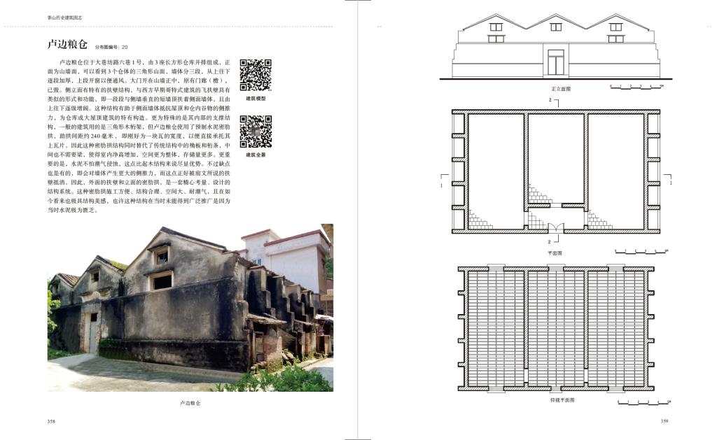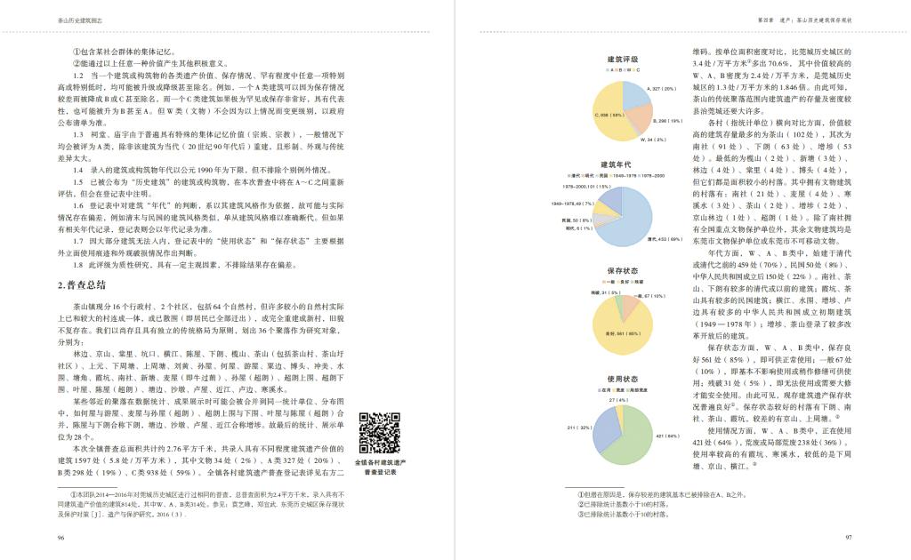 为编著本书,袁艺峰老师带着员工进行了扎实的田野调研,毯式普查了全镇所有传统聚落,某些普查区域延伸到1990年代的新村范围,总普总面积共计约276万平方米,共录入具有不同程度建筑遗产价值的建筑1597处,由此基本确认了全镇的建筑遗产留存情况。其后编著团队实地测绘绘制了50余座建筑的图纸,并附遗产分布图、统计表,以便读者从另一更科学客观的角度了解茶山的历史建筑,作为基础研究资料,也有助于后续的进一步研究。除了测绘图纸,该书还附带了许多建筑、村落的360°全景图、数字模型二维码,读者可以通过手机扫码,以更为交互、具象、身临其境的方式观察屏幕内展示的另一番茶山历史建筑景象。这种传播媒介的创新也是本研究跨领域的尝试。