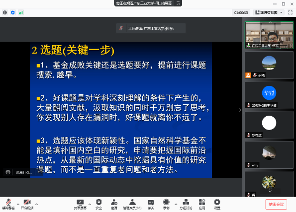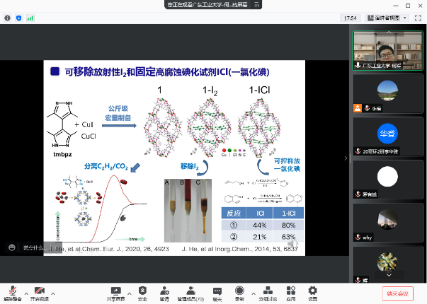 11月3日上午,何军教授为公司师生做“新型导电MOF的设计合成”报告并分享国家自然科学基金申报经验。金属有机框架(MOFs)具有结构高度有序、大比表面积、高孔隙率、容易设计合成等特点,已表现出在气体吸附、分离、存储、催化、传感及医学成像等方面具有广阔的应用前景。长久以来,人们一直认为MOFs强度太低、孔功能匮乏、导电性能差等问题,无法实现在工业上大规模应用。何军教授围绕以上问题,介绍了他课题组在新型导电MOF的设计合成上取得的阶段性进展。此外,何军教授还与环建师生分享了申报国家基金的个人经验。