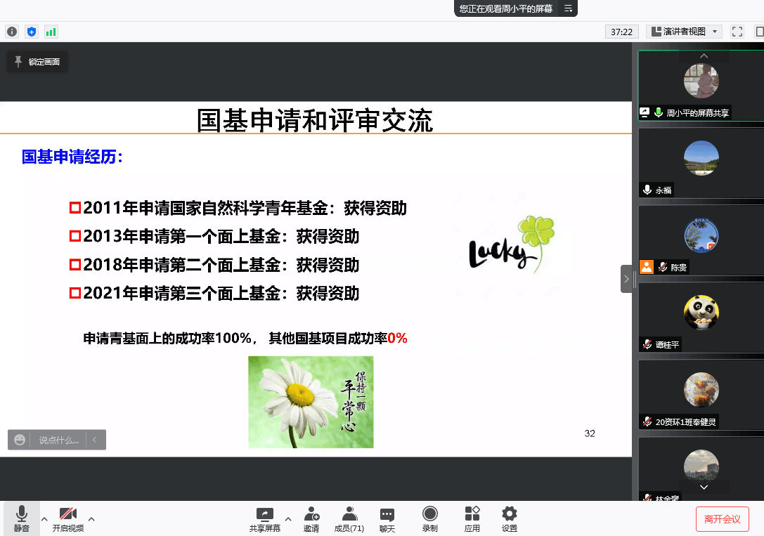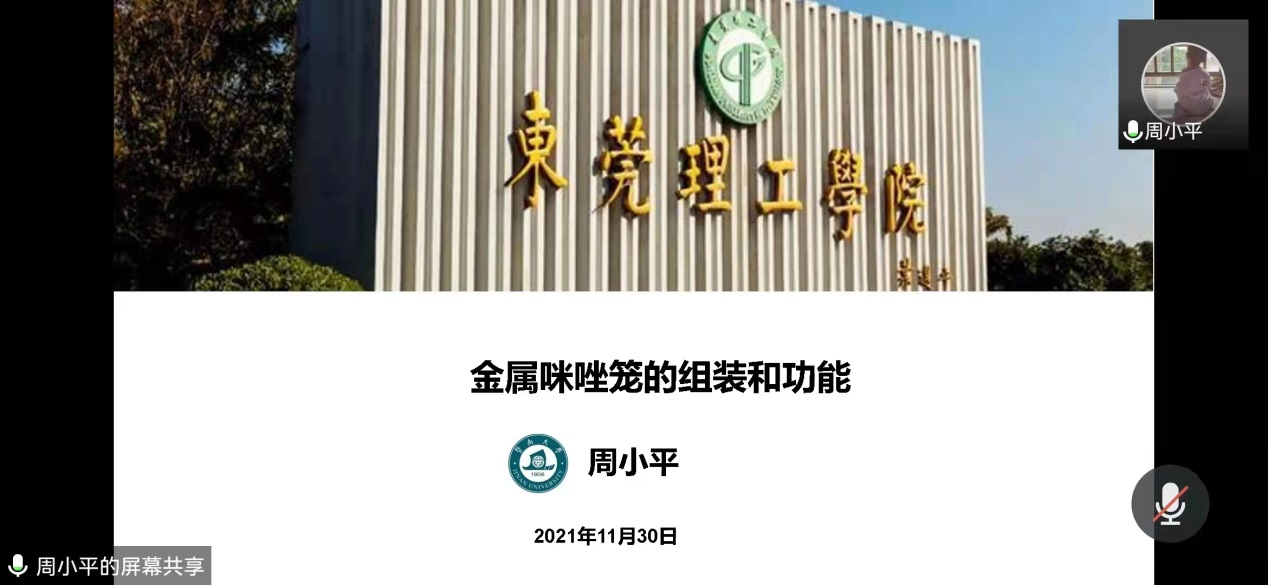 2021年11月30日,暨南大学化学与材料公司副经理周小平教授应邀为公司师生做了题为“金属咪唑笼的组装与功能”的线上报告。在报告中,周教授为我们介绍了金属有机笼的合成方法及性质特点,并重点介绍了该类化合物作为类芬顿光催化剂,用来高效降解罗丹明B的应用。学术报告结束后,周教授以国家自然科学基金项目申请人的身份,与大家分享了申请国基的经验,另外还以国基评审人的角色,介绍了国基申报书存在的一些通病,让大家引以为戒。学术交流及经验分享会的气氛热烈,收到了很好的效果。