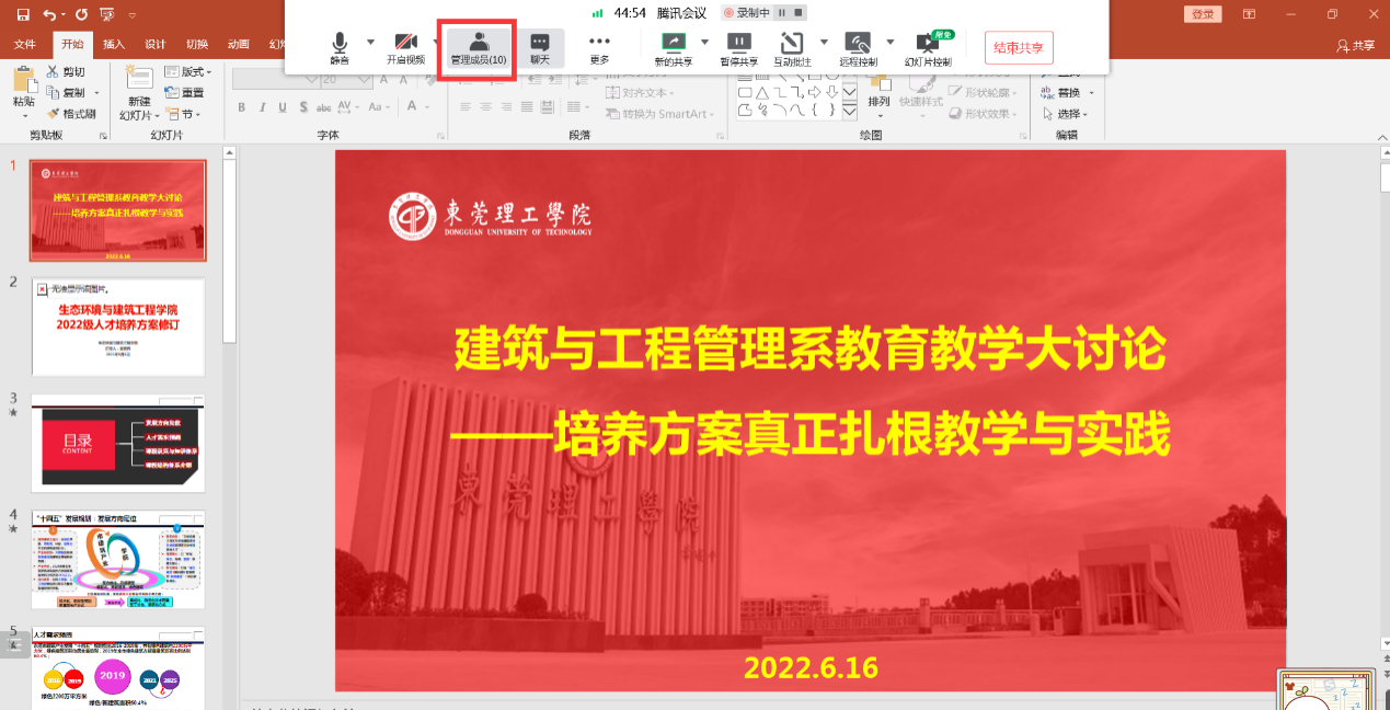 2022年6月16日,建筑与工程管理系全体教师通过腾讯会议开展了培养方案真正扎根教学与实践的公司产品大讨论。首先,吴晓伟同志针对2022级工程管理专业人才培养方案整体变化进行了详细介绍与解读,接下来,李春红同志提出2022培养大纲加强了智能建造和培养综合性人才的设计,将在原有造价课程中,引入更多的企业资源,落实培养大纲中产教融合的要求,也希望公司能在企业讲师授课、联合编写教材及开发教学资源方面提供更多支持。另外,也会注意在课程中内置沟通能力的培养;其次,刘东同志针对培养计划发言,建议加大制图识图课程的学时数,且在大一阶段就完成该部分的教学;最后卢素梅认为培养方案整体布置合理,能够立足教学和实践紧跟时代培养员工的专业能力,但是通识课占比超过了核心专业课,有待进一步商榷。
