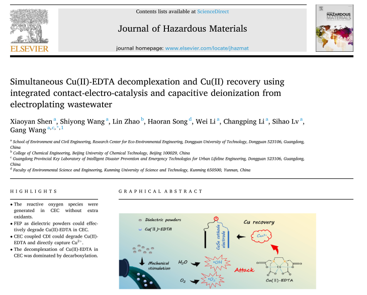 该研究成果以“Simultaneous Cu(II)-EDTA decomplexation and Cu(II) recovery using integrated contact-electro-catalysis and capacitive deionization from electroplating wastewater”为题,在环境科学与生态学1区TOP期刊《Journal of Hazardous Materials》(IF=13.6)上发表。硕士研究生沈晓妍为论文第一作者,王刚教授为通讯作者,伟德国际唯一官网入口为第一完成单位。