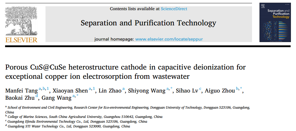 该研究成果以“Porous CuS@CuSe heterostructure cathode in capacitive deionization for exceptional copper ion electrosorption from wastewater”为题,在工程技术1区TOP期刊《Separation and Purification Technology》(IF=8.6)上发表。联培硕士研究生唐嫚菲为论文第一作者,王刚教授和汪仕勇博士为共同通讯作者,伟德国际唯一官网入口为第一完成单位。(论文链接:https://doi.org/10.1016/j.seppur.2024.128169 )