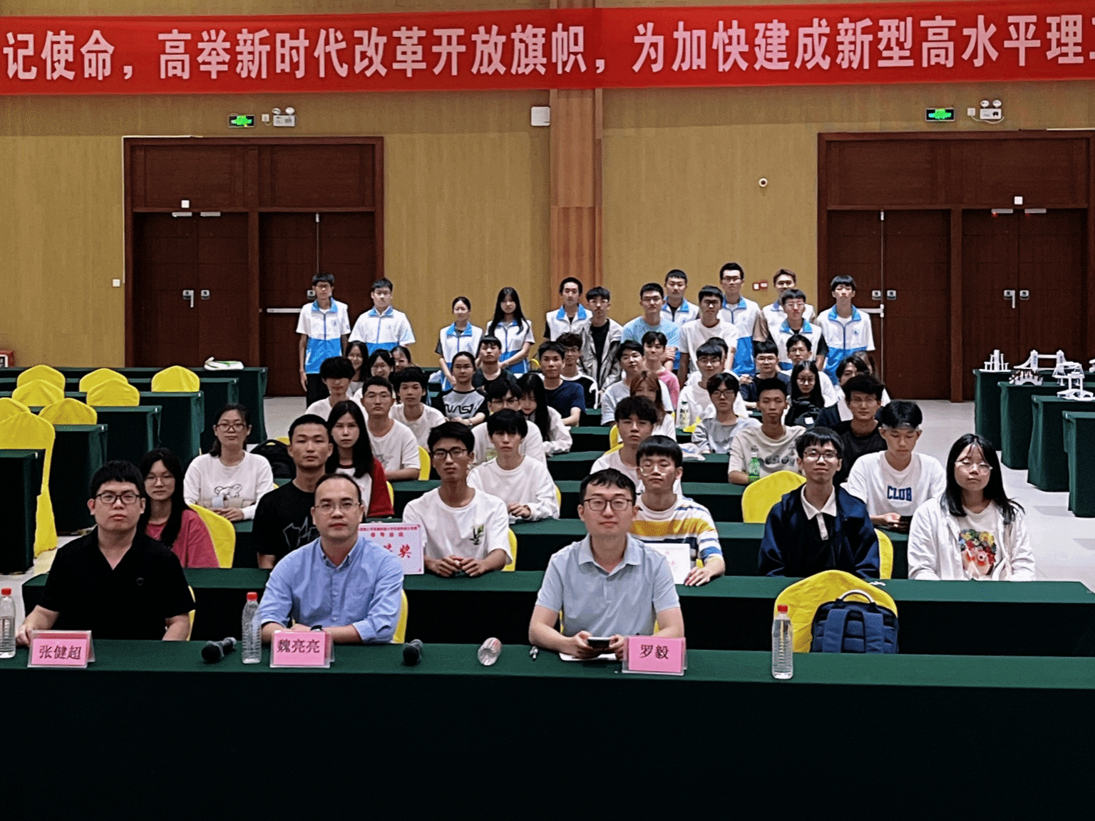 随着最后一组队伍完成答辩,各位评委老师对各组队伍的答辩评分也结束了。随后综合各组模型的外观与答辩情况等得分情况,大赛组委会统计得出了一等奖1名、二等奖2名、三等奖3名、优胜奖3名,以及最佳制作奖和最佳创意奖各1名,并由评委老师为各获奖同学颁发了获奖证书!最后,全体参赛师生合影留念,本次活动圆满结束!